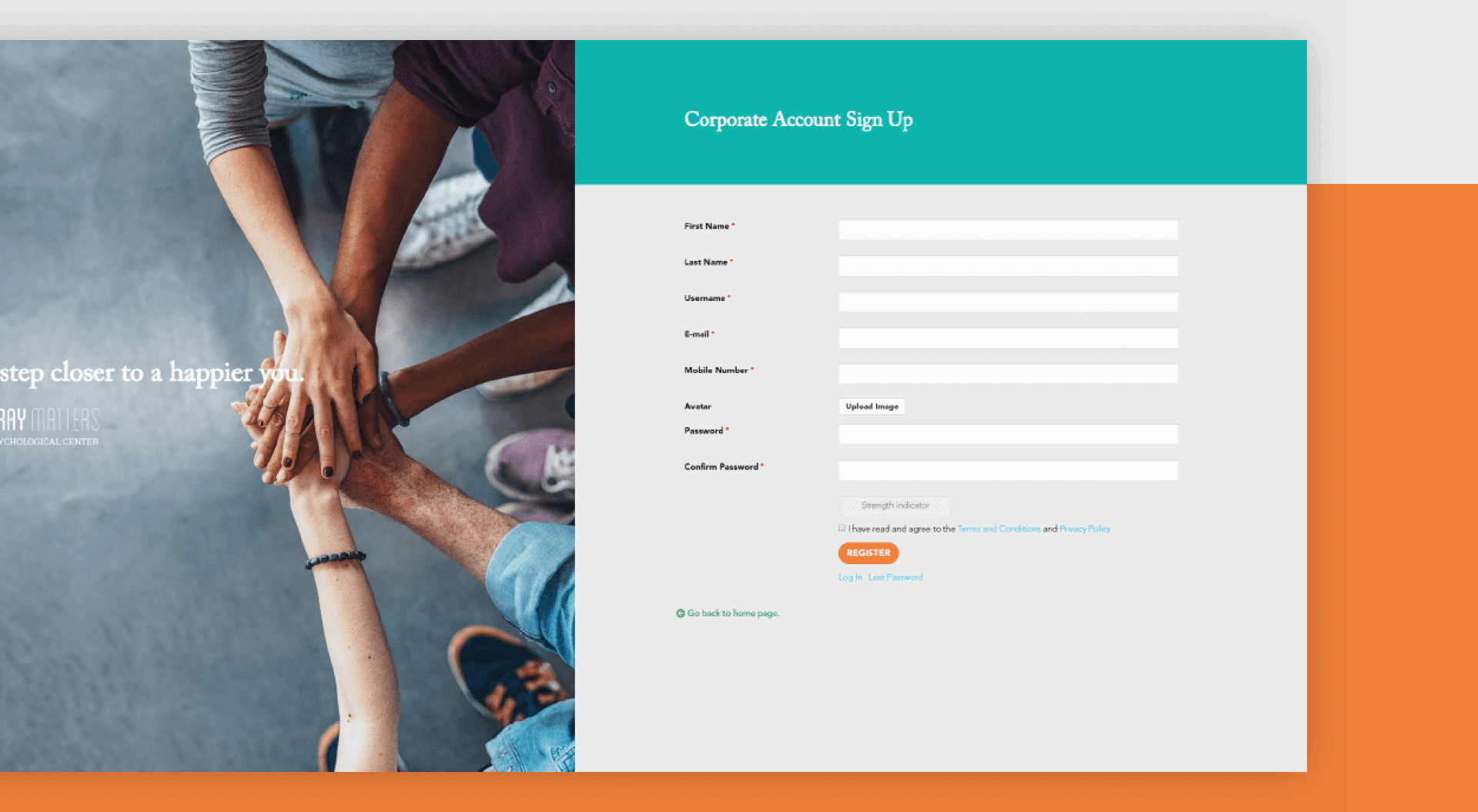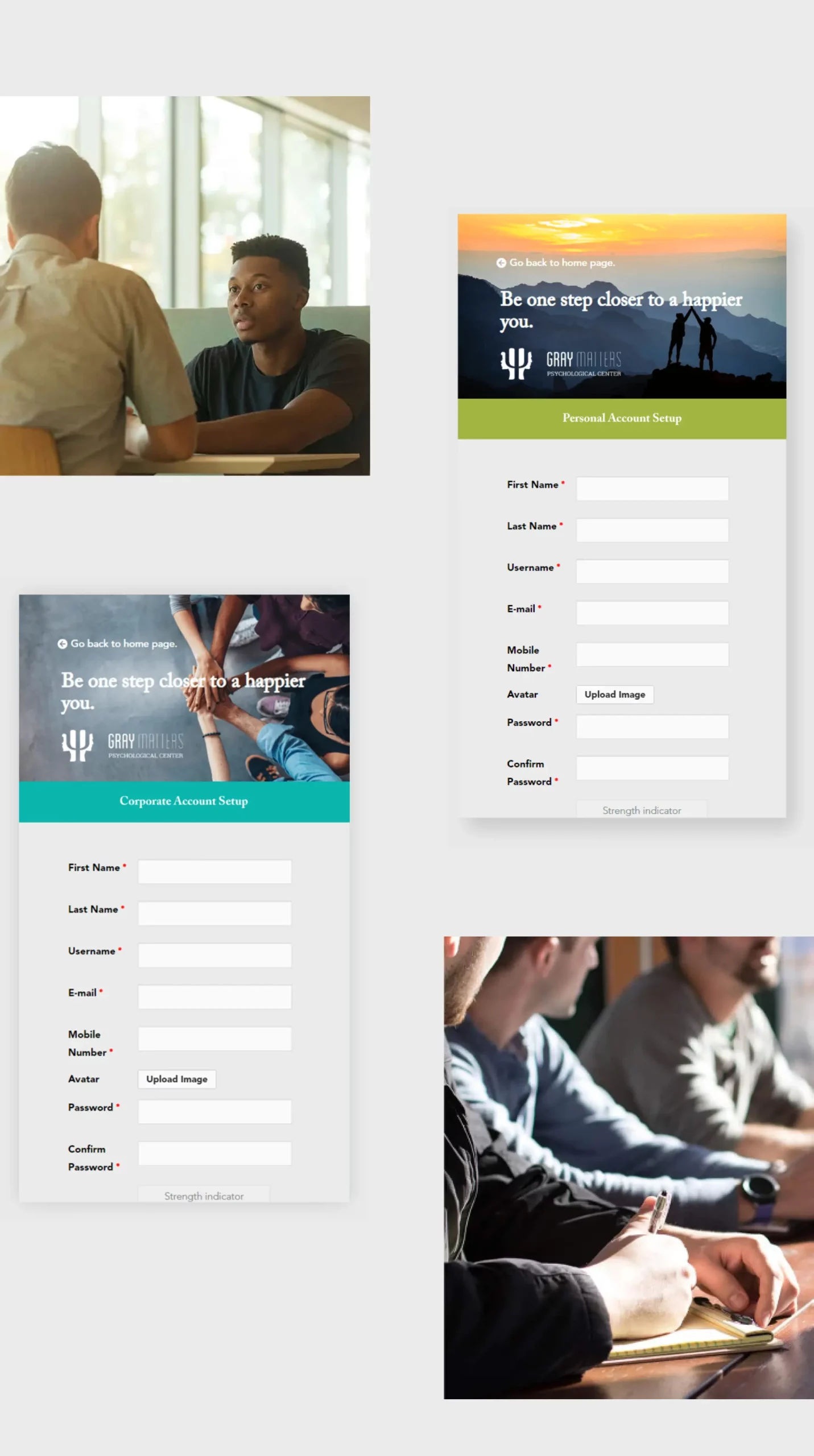For the web design, we wanted to emulate a sense of comfort and positivity the moment users step into the site. Through visuals, we subtly put the mind at ease through calming scenes of nature and human interaction. We used the colors found in their logo as accents, tabs, and headers throughout the site. These pops of color establish a bright and optimistic atmosphere while they navigate the pages for modules, tests, and consultations.
